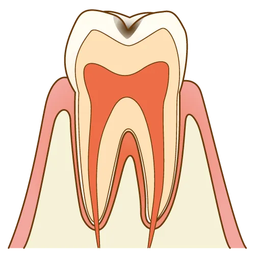歯の表面をエナメル質と呼びます。この部分が溶け始めますが痛みの自覚症状はほぼありません。