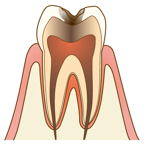 エナメル質が溶けさらに奥、象牙質と呼ばれる所までむし歯が達しています。むし歯の場所によっては、痛みやしみる症状が現れます。治療はむし歯を最小限の範囲で削り、大きさによってレジンと言われる歯科用プラスチックで詰めたり、型取りをして詰め物を作製してつけます。