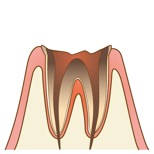 むし歯を放置した為に歯茎の深いところまでむし歯が進行してしまっている状態です。神経も死んでいる為に痛みも感じなくなります。